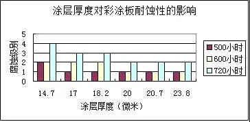 從微觀上講、涂層是多空的組織。空氣中的水、腐蝕介質(zhì)(氯離子等)就會(huì)通過(guò)涂層的薄弱部分侵入,造成膜下腐蝕,進(jìn)而涂層起泡并剝落。另外,即使同樣涂層厚度,二次涂層要比一次涂層致密。根據(jù)國(guó)外報(bào)道和相關(guān)腐蝕試驗(yàn)結(jié)果,正面涂層20μm以上才能有效的防止腐蝕介質(zhì)的侵入,由于底漆和面漆的防腐蝕機(jī)理不同,不僅要規(guī)定總膜厚,還有分別要求底漆(》5μm)和面漆(》15μm)的厚度,只有這樣,才能保證彩涂鋼板不同部位的耐蝕性是均衡的。